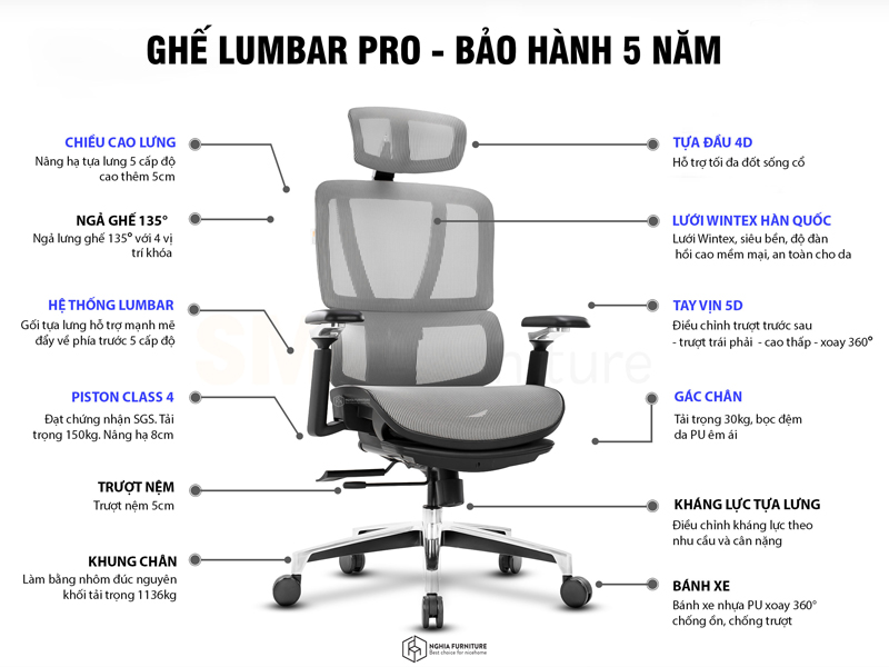 | Chân ghế | Thiết kế khung chân 5 trấu chắc chắn, chất liệu hợp kim nhôm chịu trọng tải lên tới 1136kg |