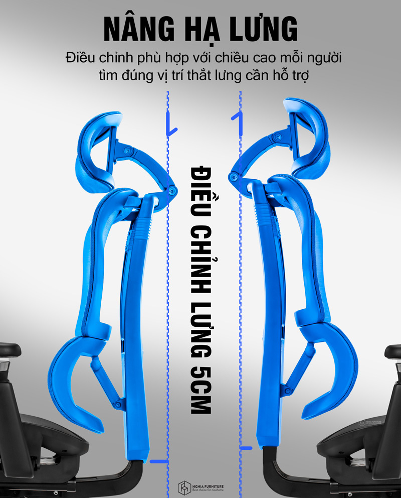 Ghế công thái học SMA Lumbar có phạm vi điều chỉnh rộng lên tới 8cm dễ dàng điều chỉnh theo chiều cao của từng người.