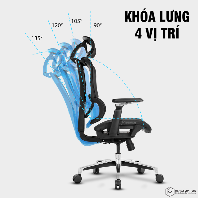 | Ngả lưng | Ghế công thái học Lumbar khóa đóng cố định và ngả lưng 4 vị trí 90-105-115-135 độ |
