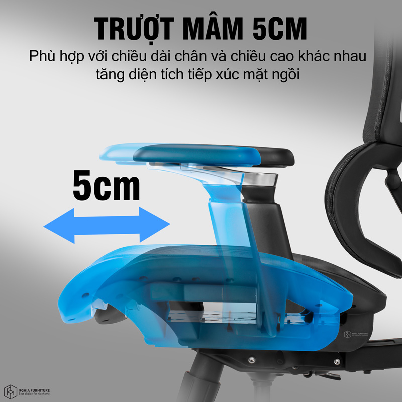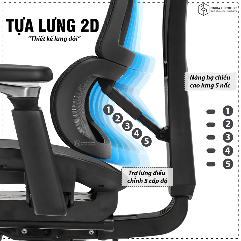 | Tựa lưng | Lưng đôi, điều chỉnh 2D nâng hạ 5 nấc, điều chỉnh độ nghiêng 5cm phù hợp với thể trạng của từng người |