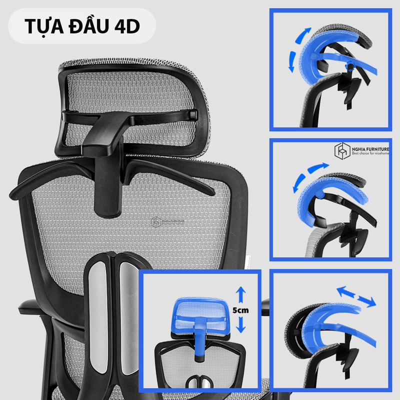 Tựa đầu điều chỉnh linh hoạt theo 4 hướng: nâng – hạ, cụp – ngửa - lên xuống, và trượt tiến – lùi, hỗ trợ tối đa phần cổ và gáy theo nhiều tư thế ngồi khác nhau. Dù làm việc hay ngả lưng thư giãn, bạn đều tìm được vị trí tựa thoải mái và chính xác nhất.