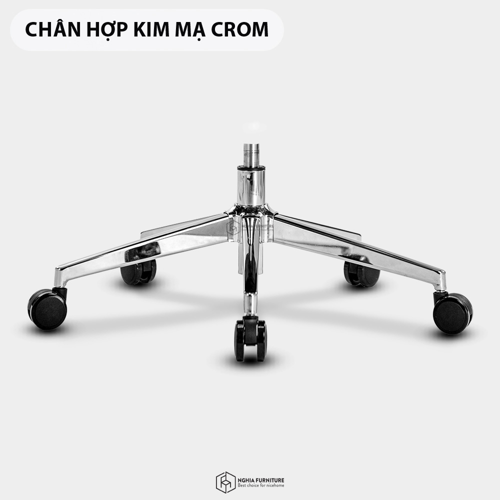 Phần chân ghế được chế tạo từ hợp kim nhôm mạ crom sáng bóng, không chỉ tạo điểm nhấn thẩm mỹ mà còn có khả năng chịu lực lên tới 500kg – hiếm thấy ở sản phẩm tầm giá phổ thông.