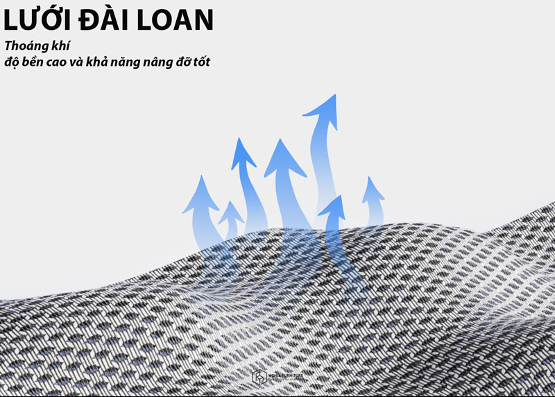 Toàn bộ mặt ngồi và lưng ghế được phủ lưới Đài Loan cao cấp – thoáng khí, đàn hồi tốt và bền bỉ theo thời gian. Chất liệu này giúp hạn chế tích nhiệt, chống xẹp lún và mang đến cảm giác mát mẻ suốt cả ngày dài ngồi làm việc.