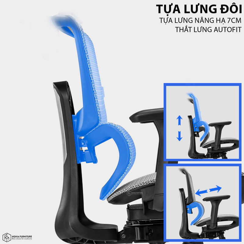 Thiết kế tựa lưng đôi tách biệt giúp ôm trọn phần lưng và phân bổ lực đều hơn, hỗ trợ hiệu quả vùng cột sống từ L1–L5. Nhờ cơ chế linh hoạt, tựa lưng bám theo chuyển động cơ thể, giữ tư thế ngồi chuẩn trong nhiều giờ mà không gây đau mỏi.