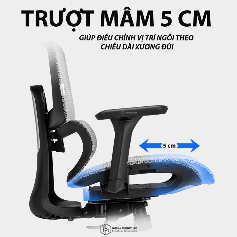 Với tính năng trượt mâm ngồi về trước – sau tới 5cm, bạn có thể điều chỉnh chiều sâu mặt ghế để tránh tì đè lên phần sau đầu gối – nguyên nhân gây tê chân khi ngồi lâu. Đây là một chi tiết nhỏ nhưng cực kỳ quan trọng giúp tối ưu tư thế và lưu thông máu tốt hơn.