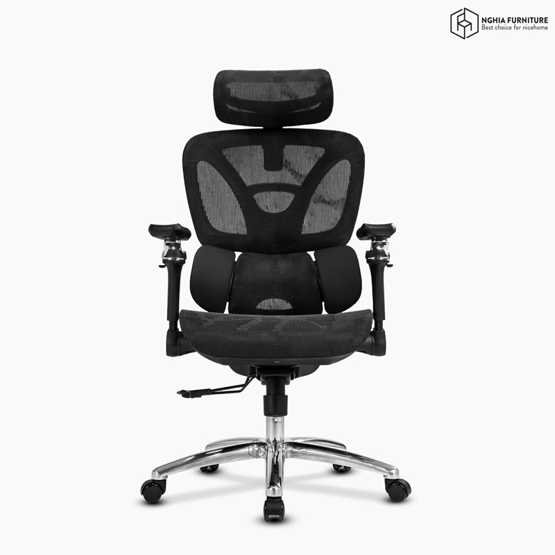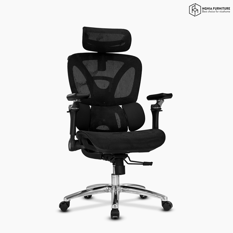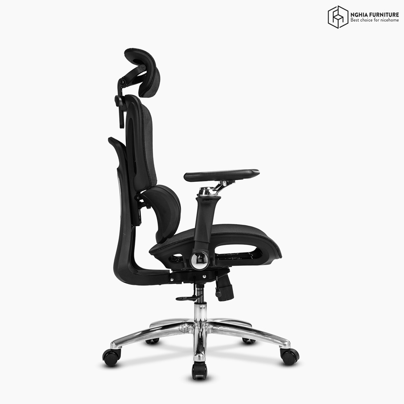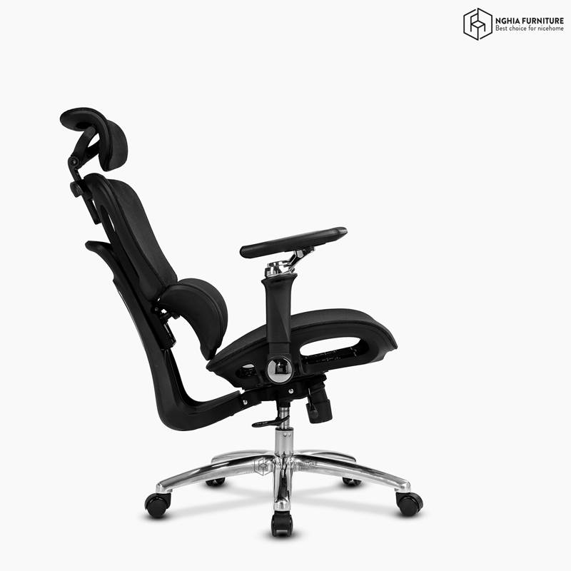 Tựa đầu điều chỉnh theo ba hướng: nâng – hạ, gập góc độ, và xoay linh hoạt giúp nâng đỡ cổ – gáy đúng điểm tựa. Nút khóa điều chỉnh góc còn cho phép chuyển đổi nhanh chóng giữa tư thế làm việc, nghỉ ngơi hoặc ngả lưng thư giãn.