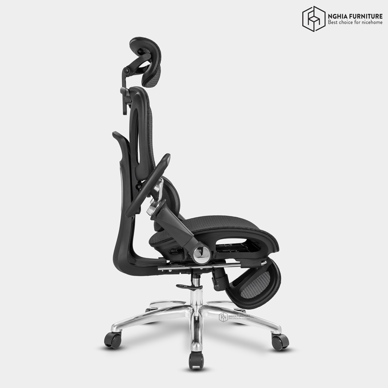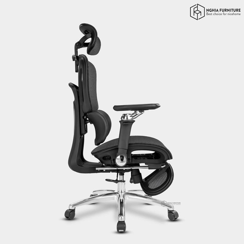 Tựa đầu điều chỉnh theo ba hướng: nâng – hạ, gập góc độ, và xoay linh hoạt giúp nâng đỡ cổ – gáy đúng điểm tựa. Nút khóa điều chỉnh góc còn cho phép chuyển đổi nhanh chóng giữa tư thế làm việc, nghỉ ngơi hoặc ngả lưng thư giãn.