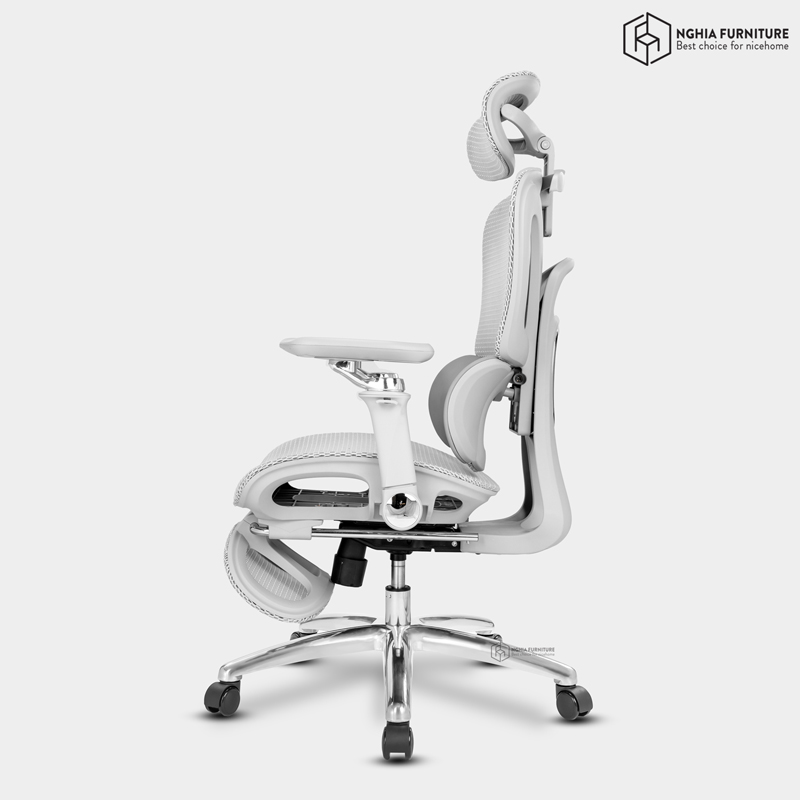 Tựa đầu điều chỉnh theo ba hướng: nâng – hạ, gập góc độ, và xoay linh hoạt giúp nâng đỡ cổ – gáy đúng điểm tựa. Nút khóa điều chỉnh góc còn cho phép chuyển đổi nhanh chóng giữa tư thế làm việc, nghỉ ngơi hoặc ngả lưng thư giãn.