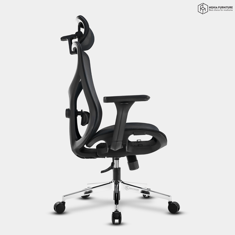 Tựa đầu có khả năng nâng hạ và điều chỉnh góc nghiêng, đảm bảo nâng đỡ phần cổ gáy thoải mái hơn khi ngồi làm việc hoặc khi ngả lưng thư giãn.