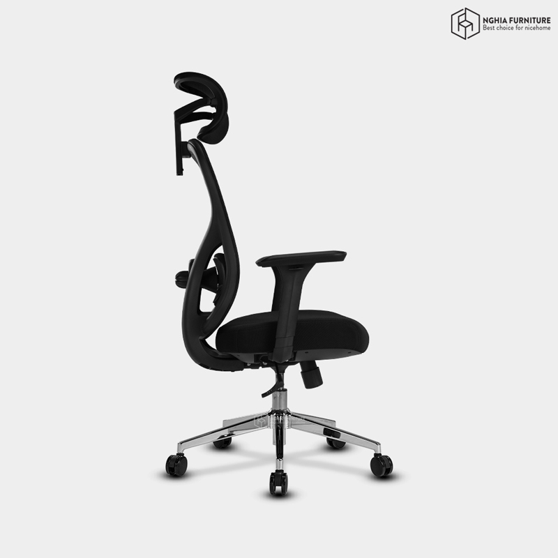 Tựa đầu có khả năng nâng hạ và điều chỉnh góc nghiêng, đảm bảo nâng đỡ phần cổ gáy thoải mái hơn khi ngồi làm việc hoặc khi ngả lưng thư giãn.