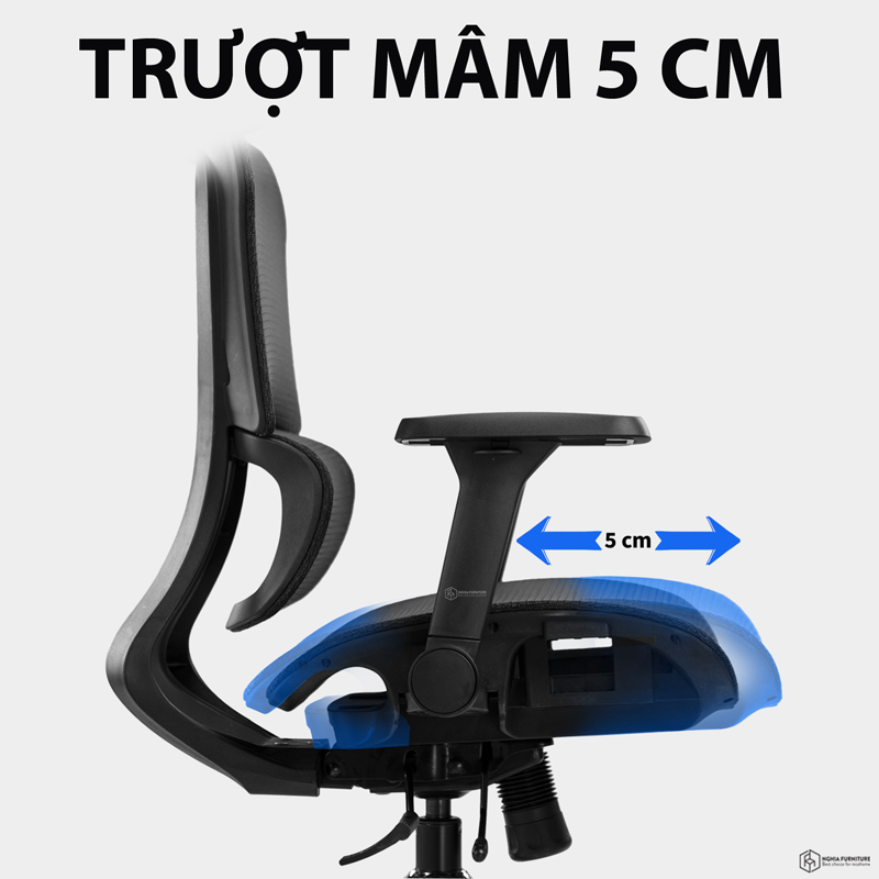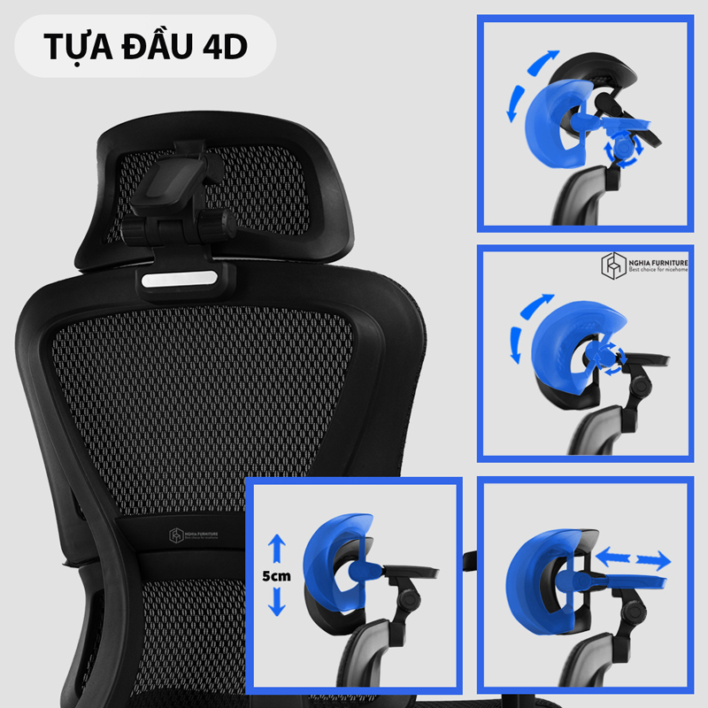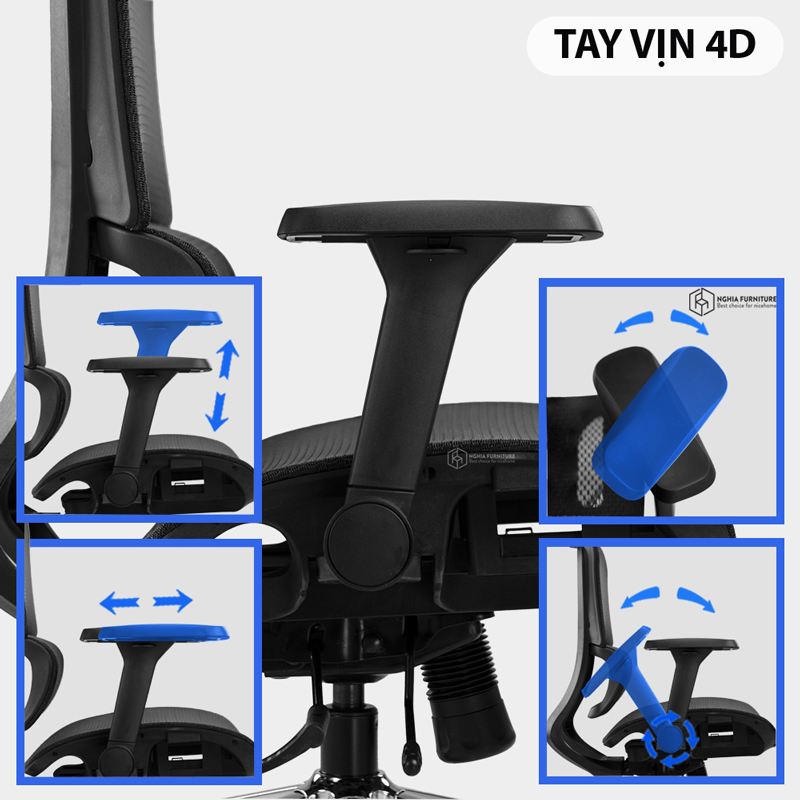 Tay vịn 4D có thể điều chỉnh chiều cao, độ trượt, hướng xoay và độ rộng, mang đến sự linh hoạt tối đa cho nhiều tư thế khác nhau – từ đánh máy, sử dụng chuột cho đến thư giãn. Cánh tay và vai luôn được đỡ đúng vị trí, giảm mỏi hiệu quả.