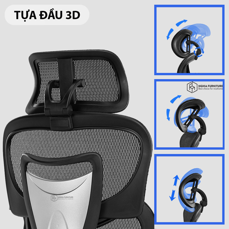 Tựa đầu bo cong theo đường cong cổ gáy, với khả năng điều chỉnh 3D (nâng hạ, cụp ngửa 45 độ, tiến lùi), mang lại sự hỗ trợ tối đa khi làm việc hoặc thư giãn. Kích thước rộng rãi và linh hoạt giúp bạn dễ dàng tìm được tư thế thoải mái nhất, giảm tải căng thẳng cho cổ và vai gáy.