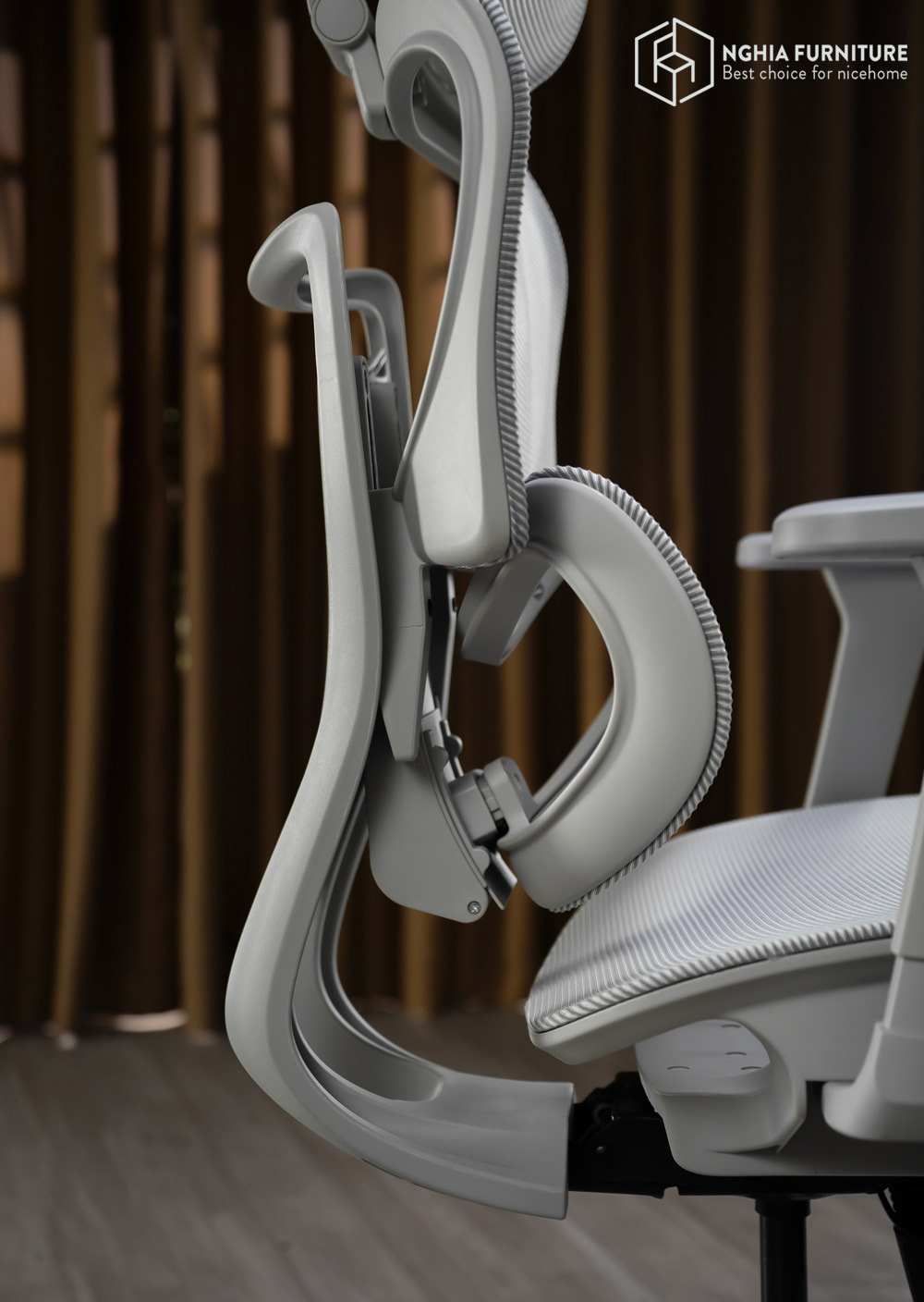 Hai phần tựa lưng tách biệt: phần dưới đỡ thắt lưng, phần trên ôm lưng giữa và lưng trên. Khi bạn thay đổi tư thế – dù ngồi làm việc hay ngả lưng nghỉ ngơi – ghế sẽ tự động điều chỉnh để duy trì độ cong tự nhiên của cột sống.