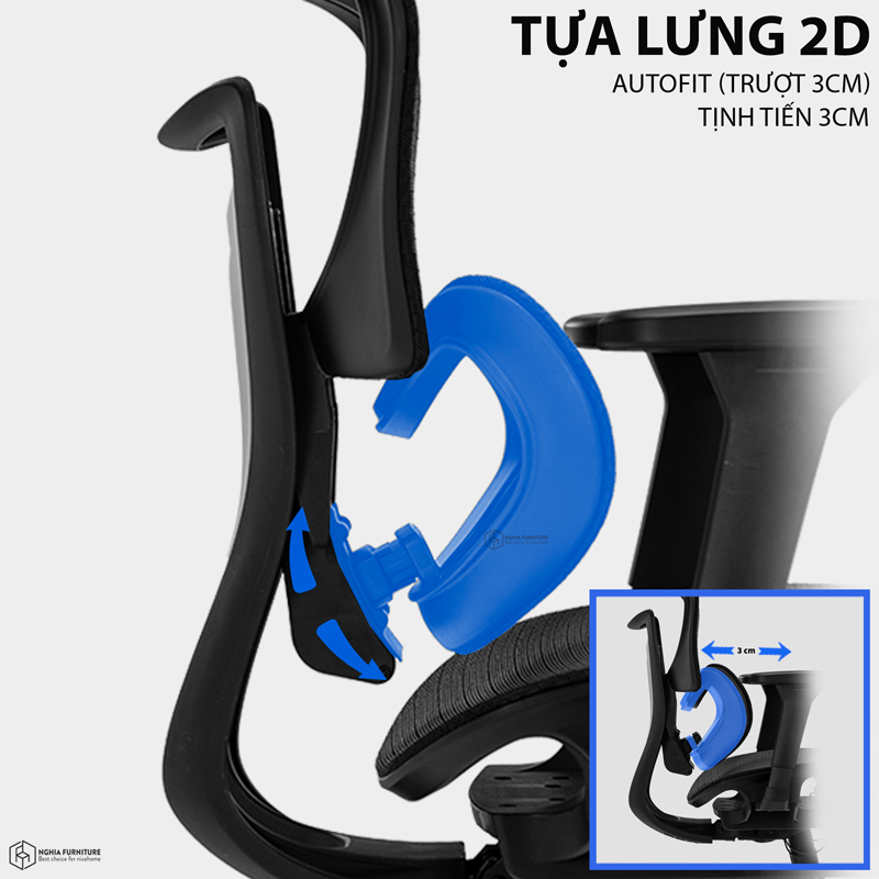 Tựa đầu bo cong theo đường cong cổ gáy, với khả năng điều chỉnh 3D (nâng hạ, cụp ngửa 45 độ, tiến lùi), mang lại sự hỗ trợ tối đa khi làm việc hoặc thư giãn. Kích thước rộng rãi và linh hoạt giúp bạn dễ dàng tìm được tư thế thoải mái nhất, giảm tải căng thẳng cho cổ và vai gáy.