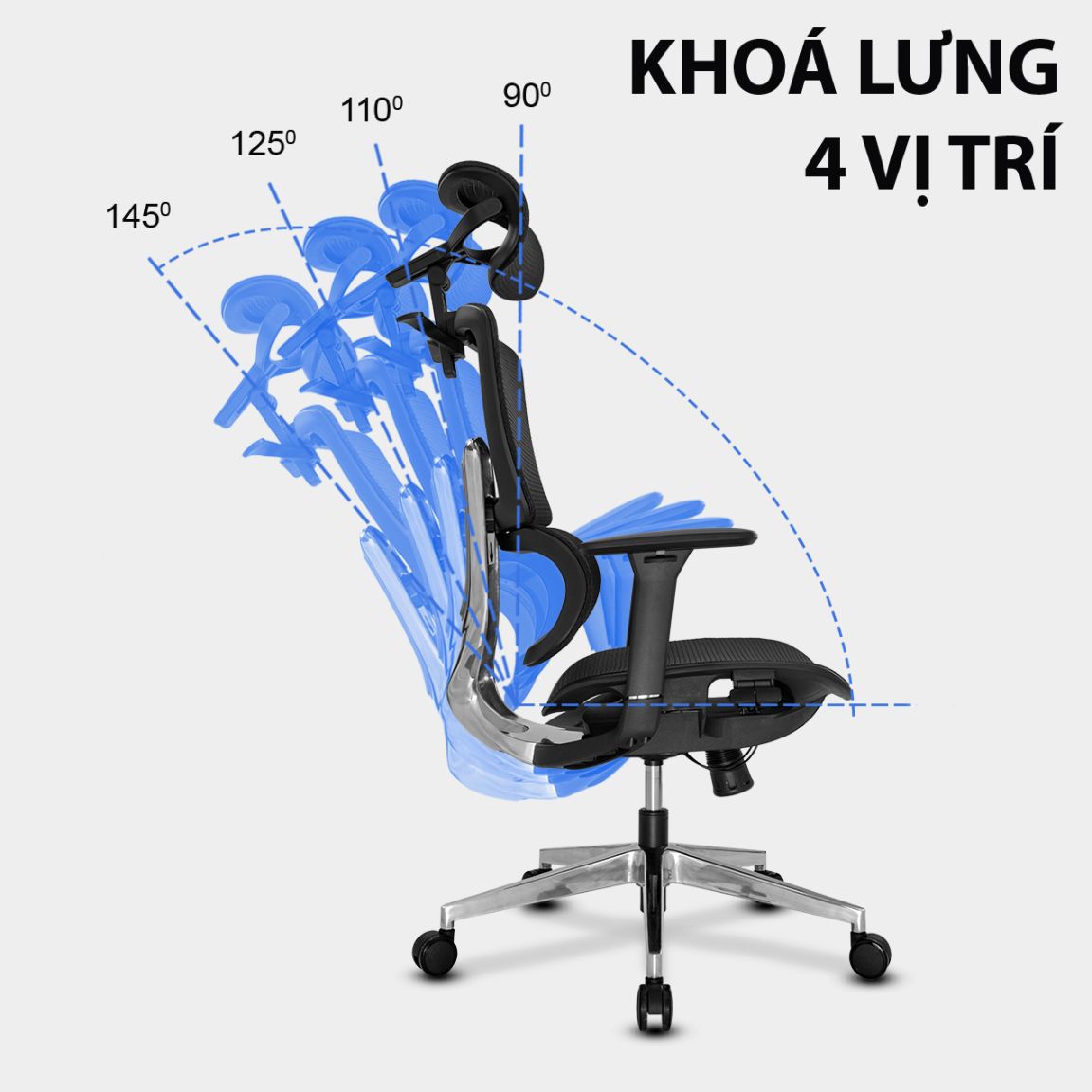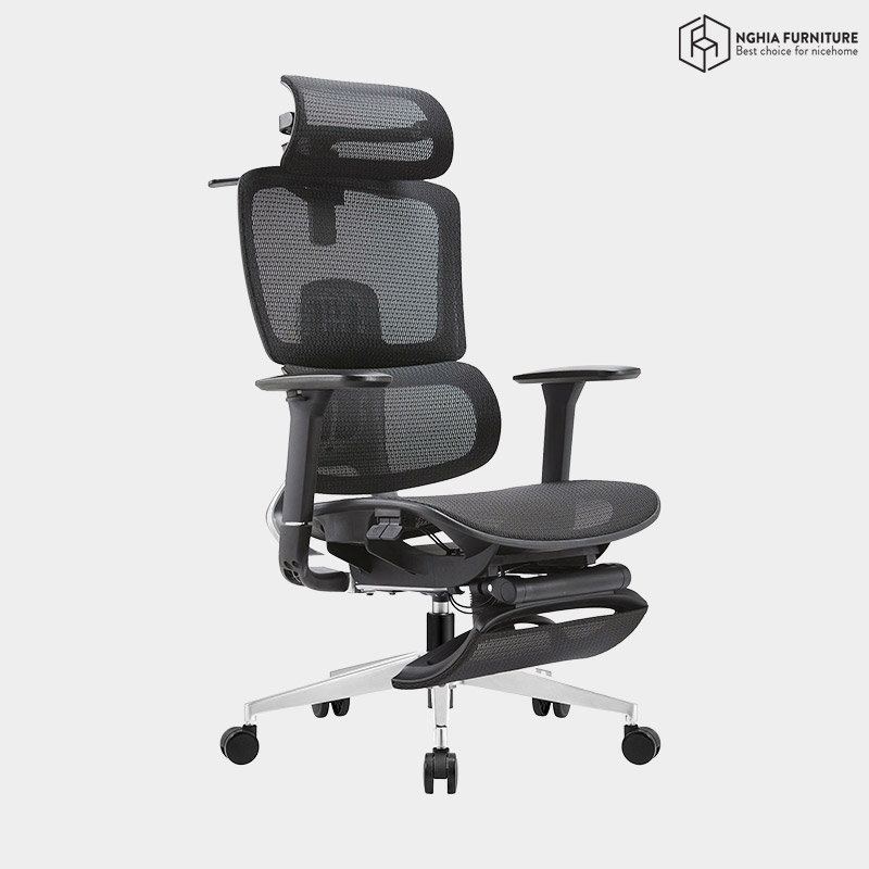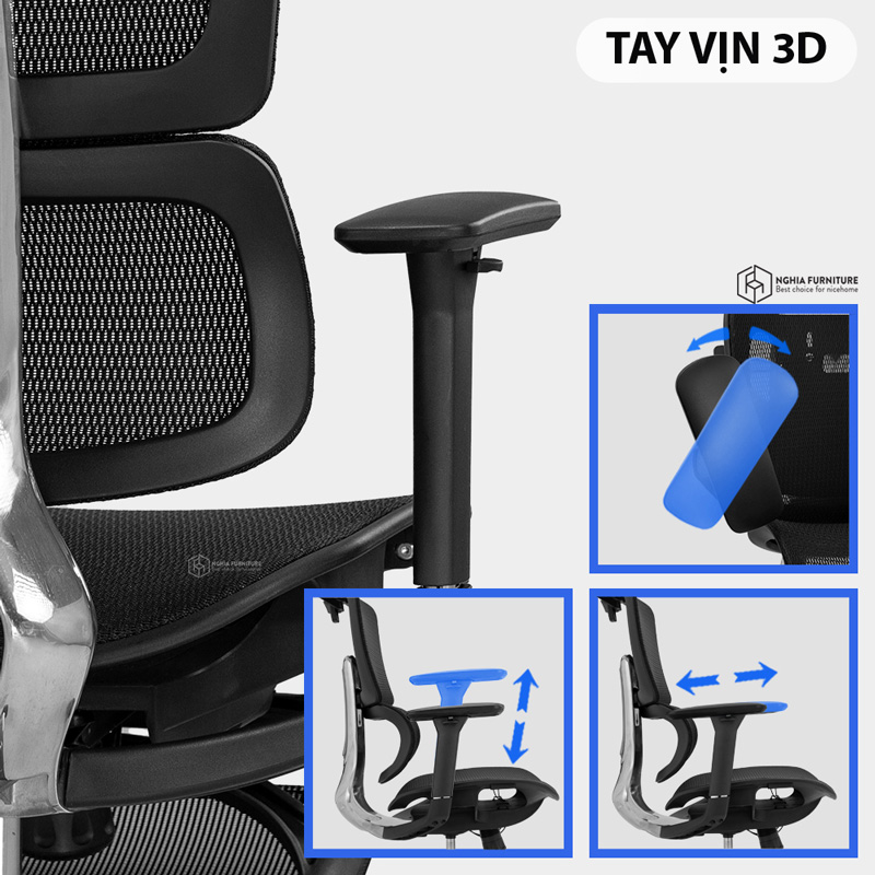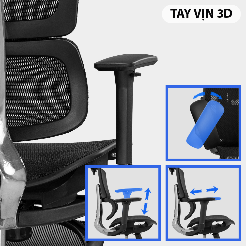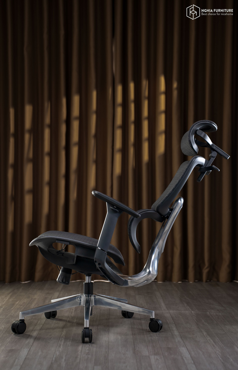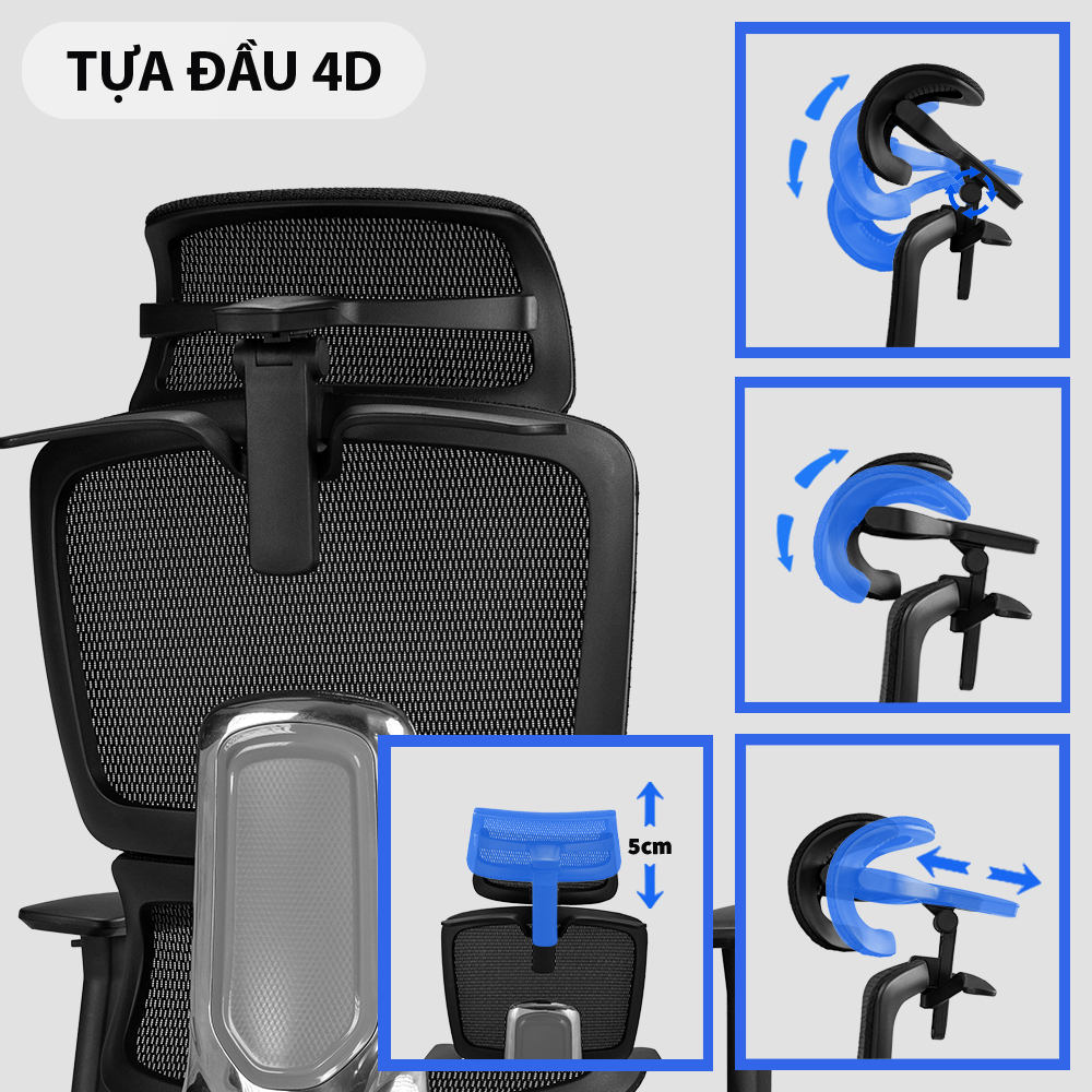Tựa đầu 4D cho phép nâng hạ, trượt trước – sau, xoay cụp ngửa và ngả nhẹ, giúp nâng đỡ trọn vẹn vùng cổ – vai, đặc biệt cần thiết cho những ai làm việc nhiều giờ liên tục.