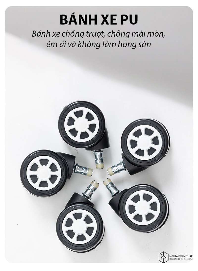 Bánh xe PU êm ái: Di chuyển không gây ồn, không làm trầy sàn.