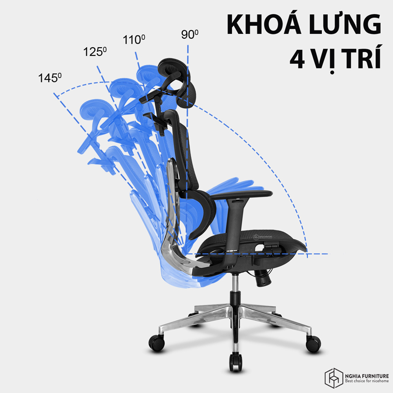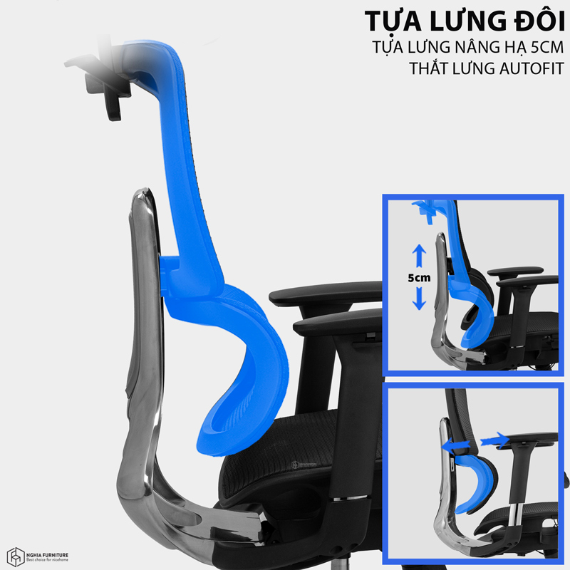 Lưng ghế được thiết kế theo đường cong sinh lý tự nhiên, trong đó lưng dưới có thể nâng hạ linh hoạt, giúp ôm sát phần thắt lưng và thích hợp cho mọi vóc dáng từ 1m55 – 1m80.