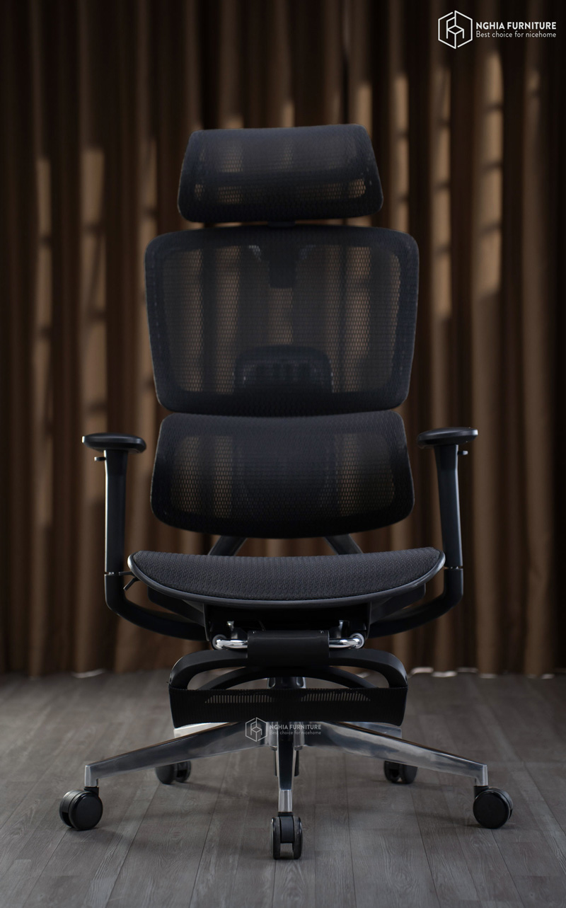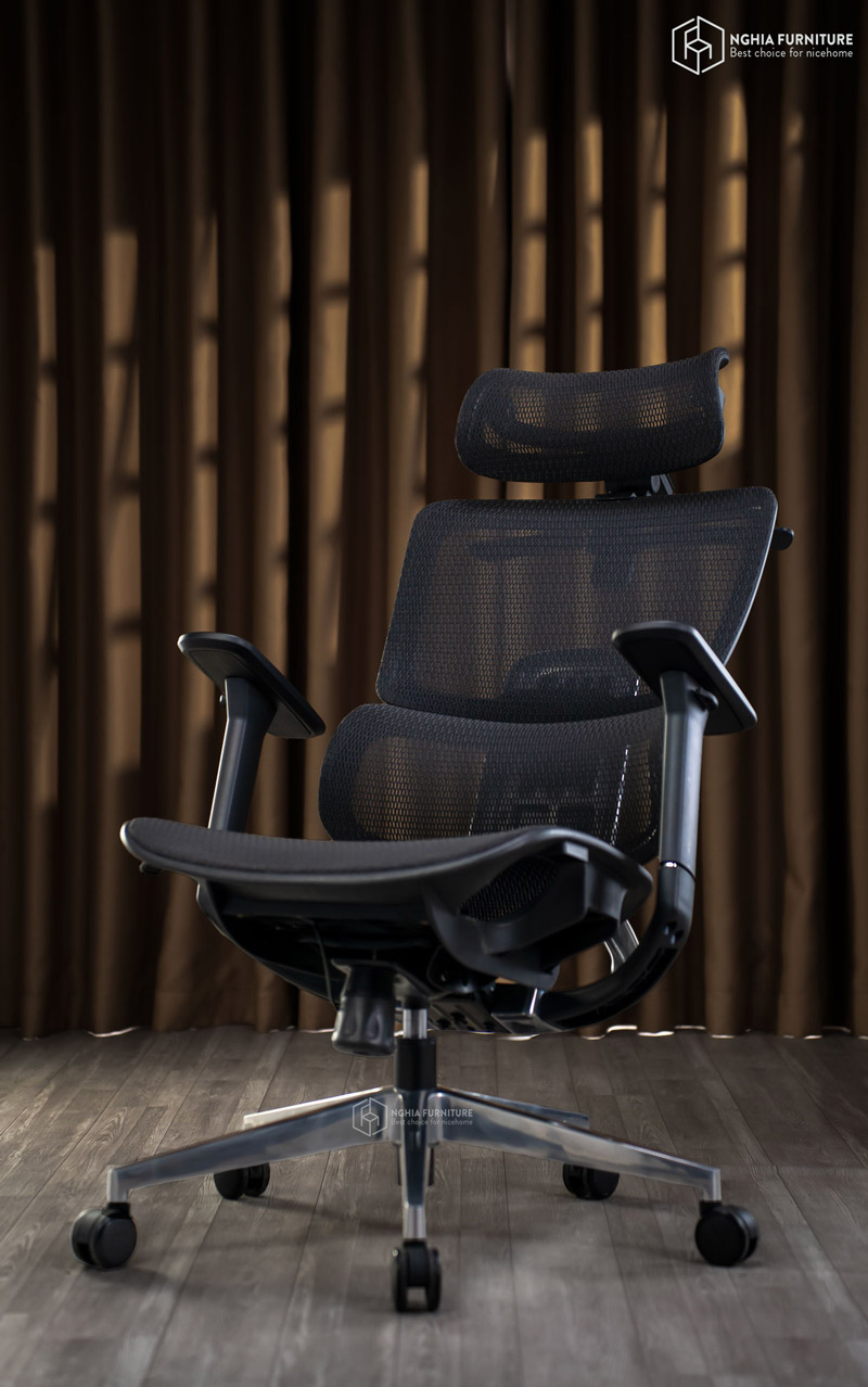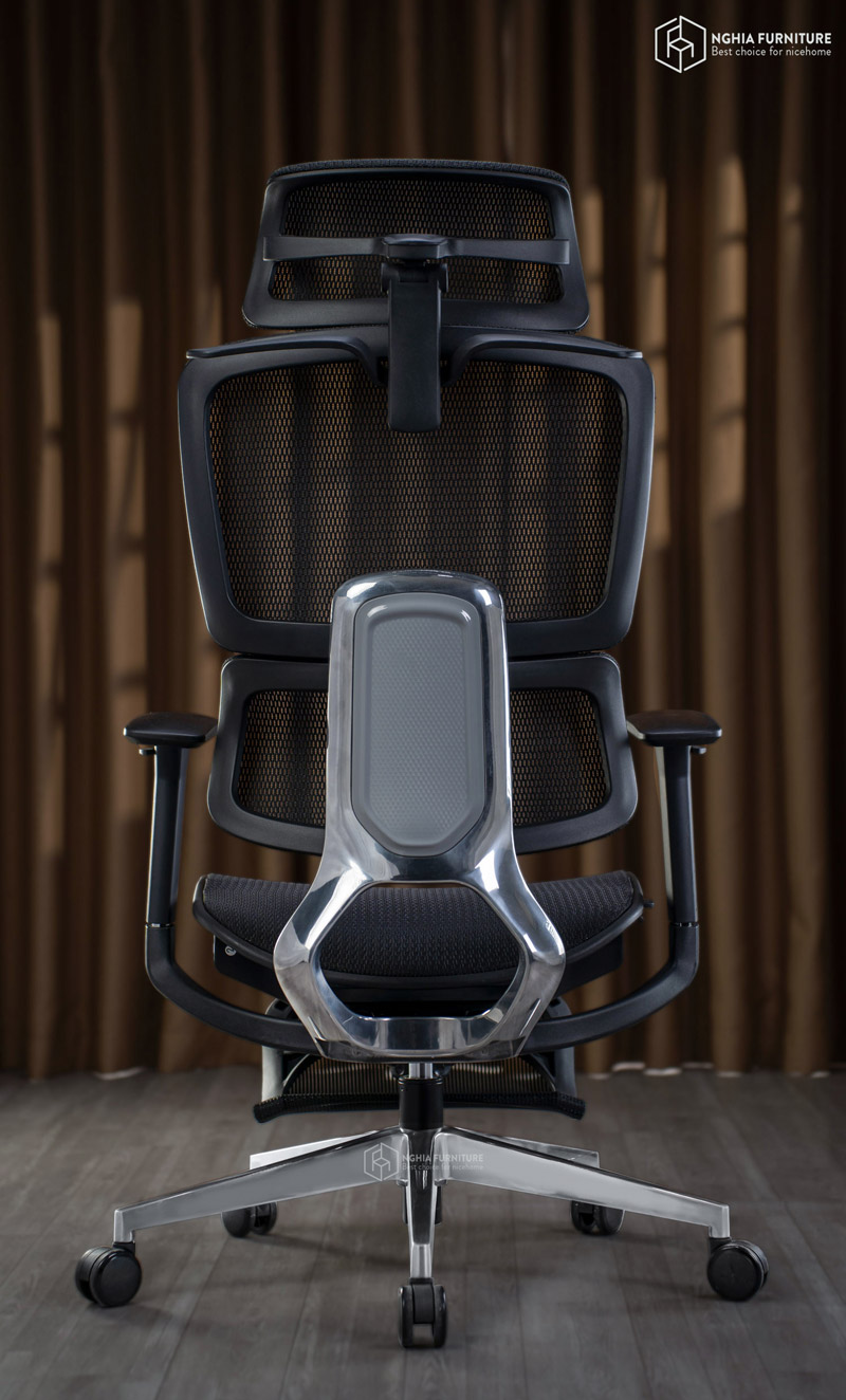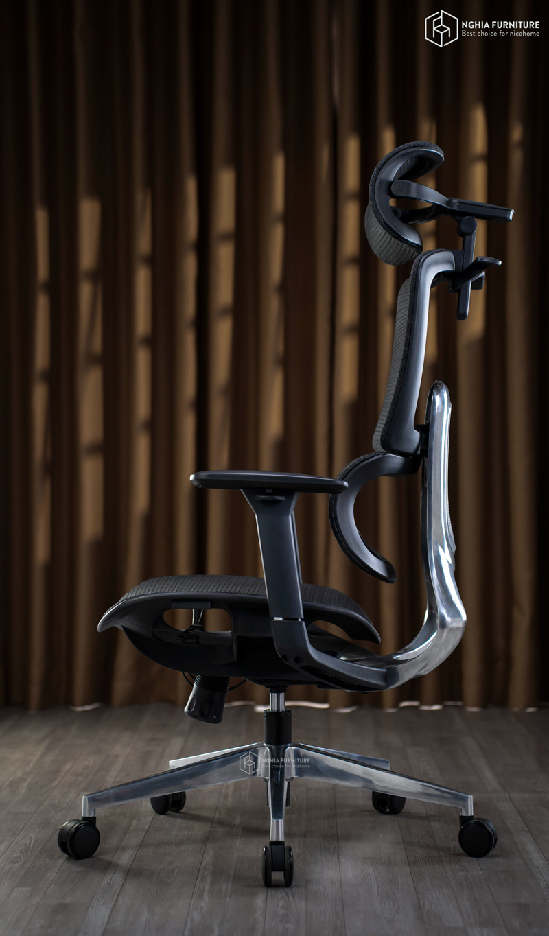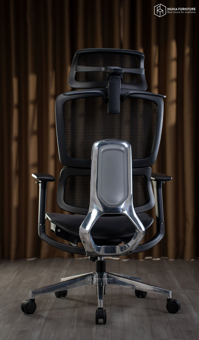 Ghế được thiết kế với phần khung tựa lưng bằng nhôm đúc chắc chắn, mang lại sự cứng cáp và độ bền vượt trội. Phần khung thân dưới sử dụng nhựa PA cao cấp, đạt tiêu chuẩn nhựa văn phòng quốc tế, đảm bảo khả năng chịu lực tốt và độ bền lâu dài. Sự kết hợp giữa khung nhôm và nhựa PA giúp ghế vừa bền chắc, vừa giữ được vẻ ngoài hiện đại, tinh tế.