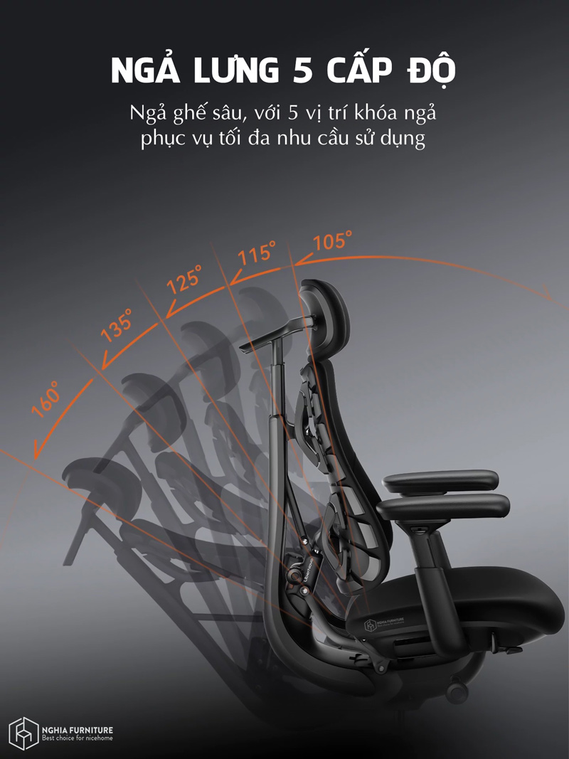 Ở góc 105°–115°, ghế hỗ trợ tư thế ngồi thẳng, giúp tăng sự tập trung. Khi chuyển sang 120°–135°, cơ thể được thư giãn hơn, phù hợp với các hoạt động sáng tạo. Và ở mức ngả tối đa 160°, ghế mang lại cảm giác nghỉ ngơi sâu, giảm áp lực toàn diện lên cột sống.
