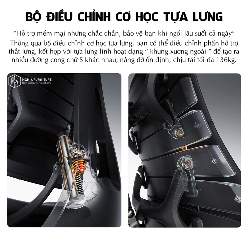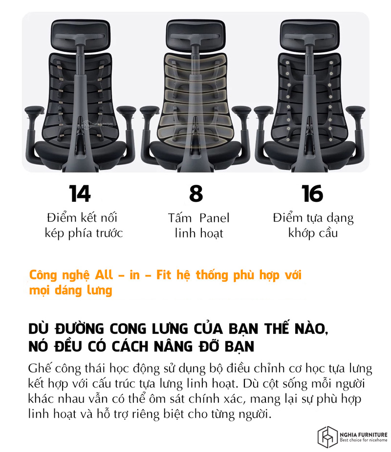 Với cấu tạo gồm 8 tấm linh hoạt, 14 điểm liên kết kép và 16 điểm xoay trên khung đỡ hai lớp, tựa lưng có khả năng thích ứng chính xác theo từng chuyển động nhỏ nhất của cơ thể.