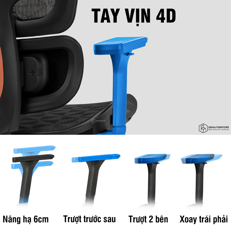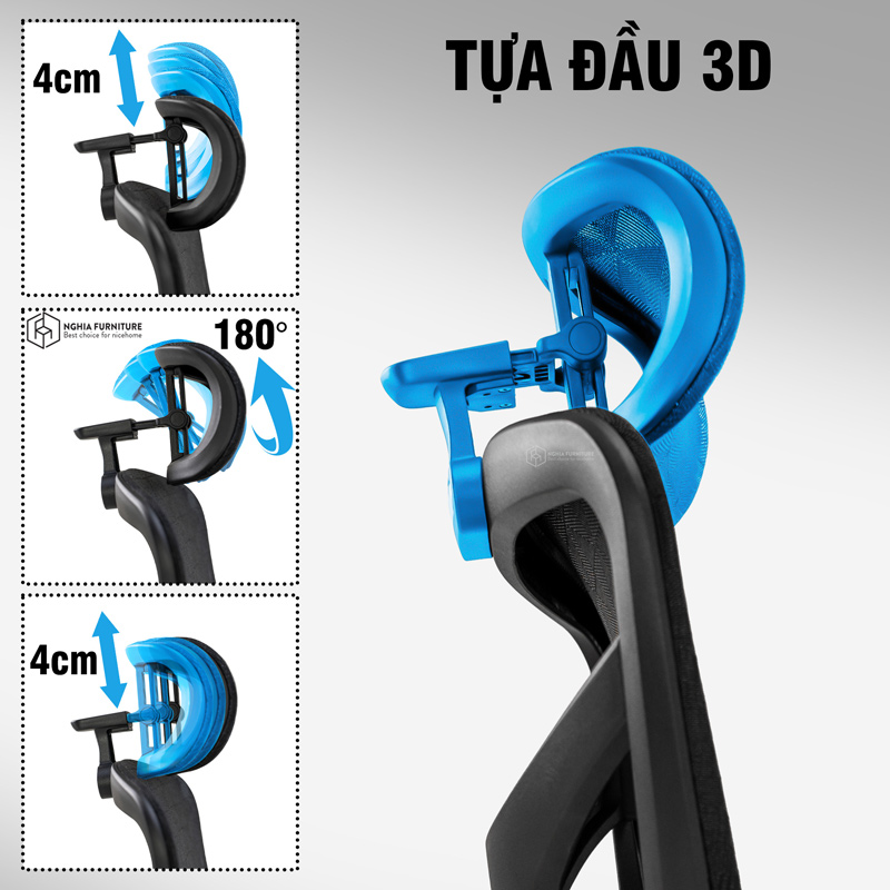 Tựa đầu có thể tăng giảm độ cao, nghiêng trước/sau và xoay theo hướng cổ, giúp đỡ trọn vẹn vùng gáy – đặc biệt quan trọng với người thường xuyên họp online hoặc làm việc ở tư thế ngửa cổ.