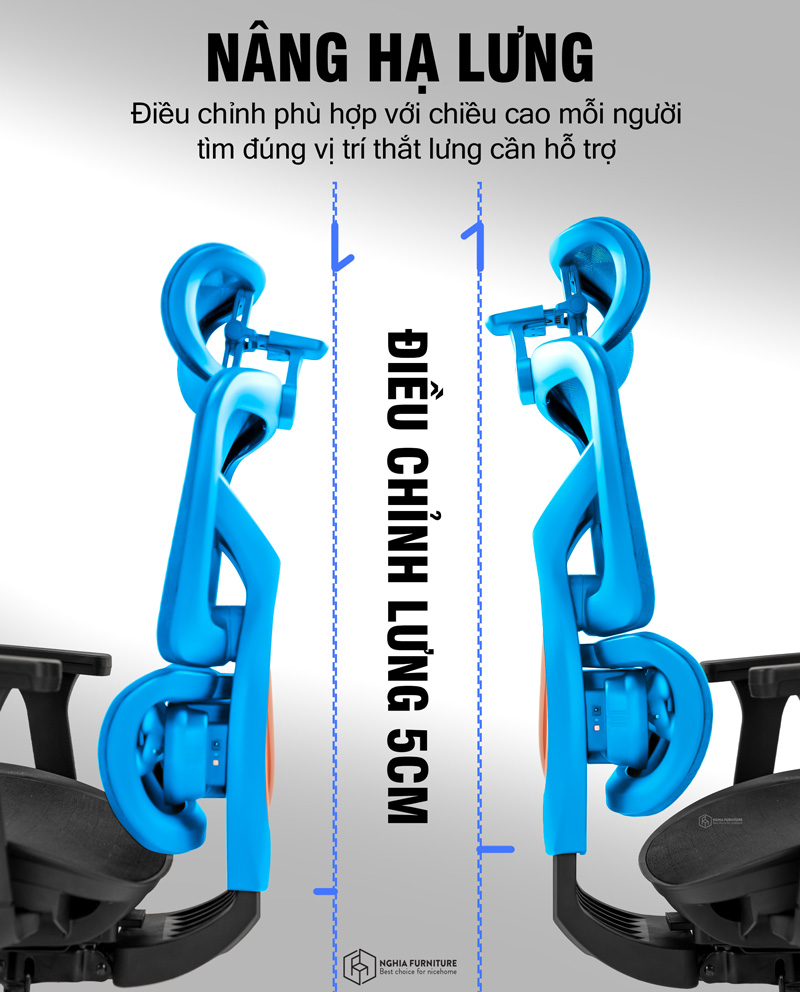 Khác biệt lớn nhất của Mass-01 nằm ở thiết kế lưng đôi độc lập, giúp chia đều áp lực lên các vùng từ thắt lưng đến lưng trên. Phần đỡ lưng có thể nâng hạ linh hoạt, phù hợp với nhiều chiều cao, thể trạng, từ đó hạn chế tối đa tình trạng đau lưng hoặc gù vai khi ngồi lâu.