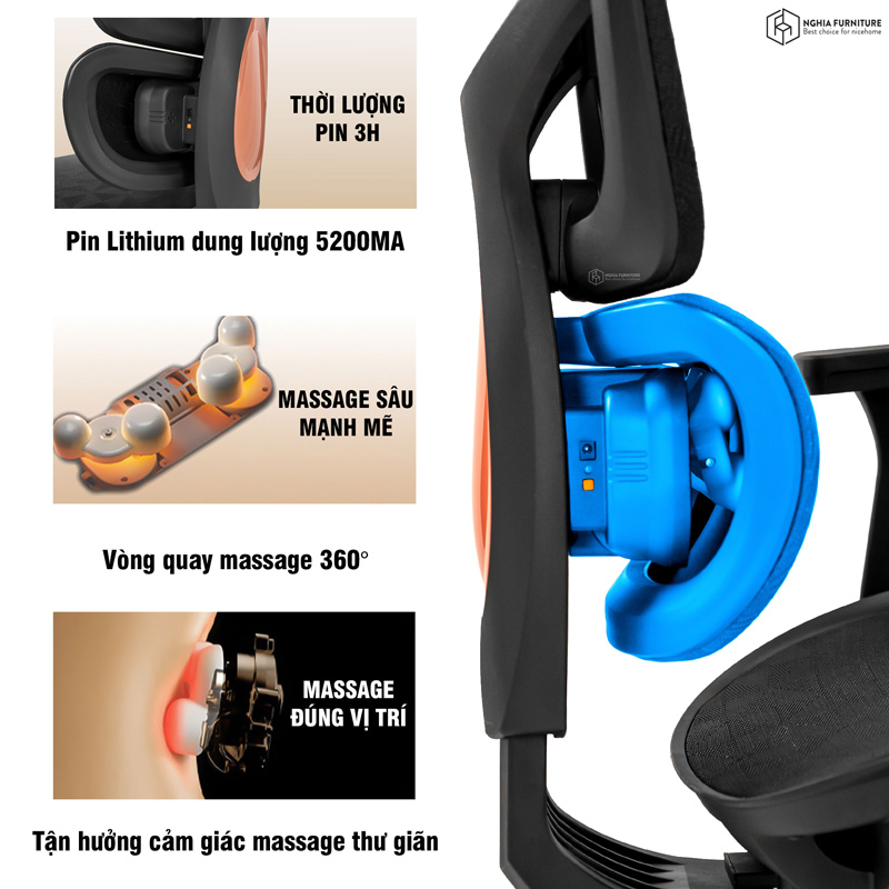 Tích hợp sẵn bộ massage rung vùng thắt lưng, giúp giảm căng cơ, lưu thông máu và mang đến cảm giác thư giãn mà không cần rời khỏi bàn làm việc.