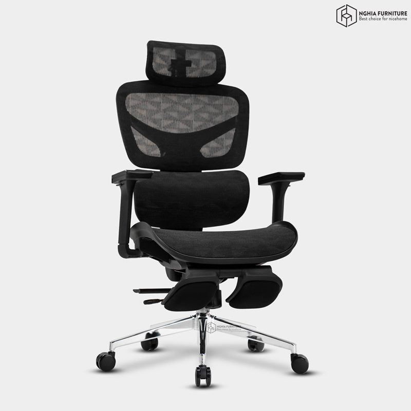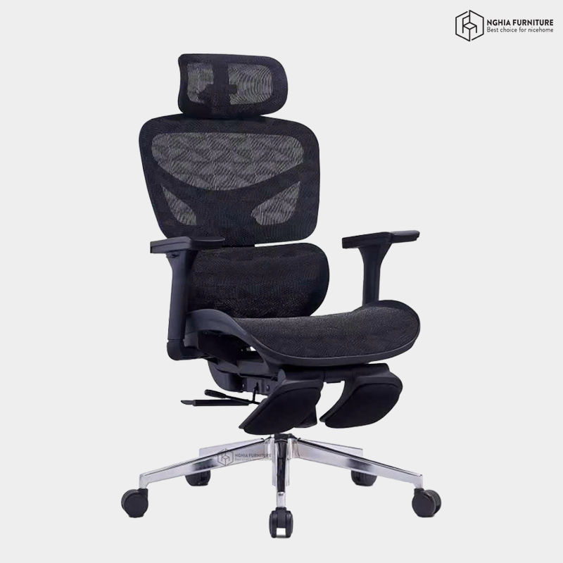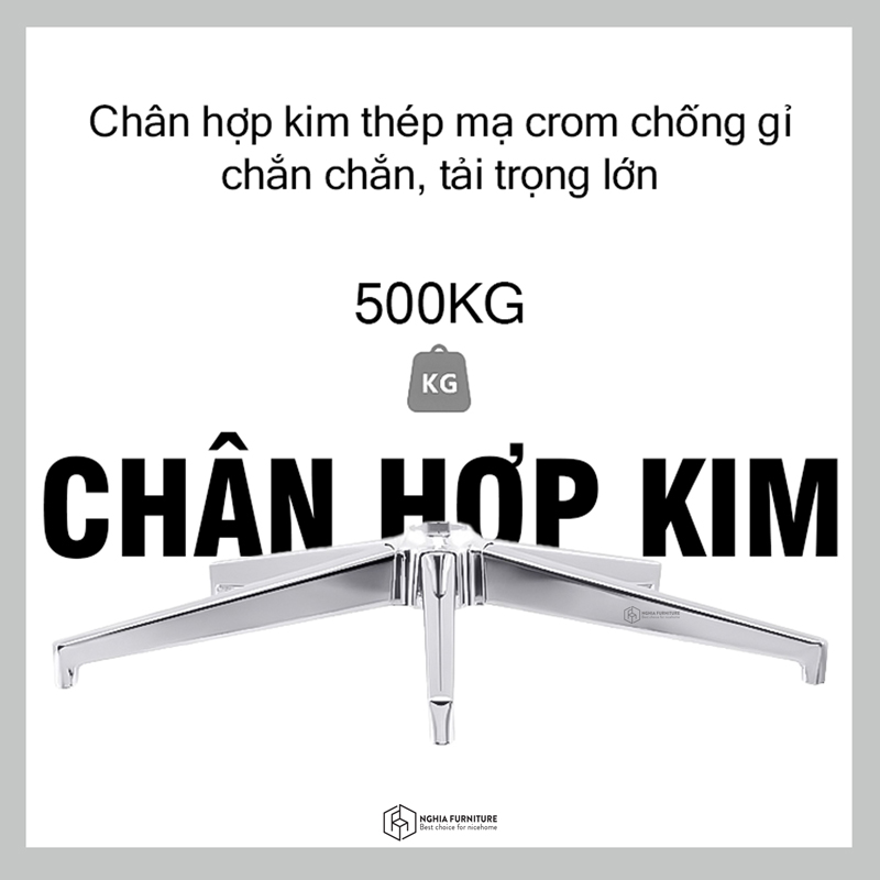 Phần chân được đúc nguyên khối từ hợp kim nhôm, phủ mạ crom sáng bóng, vừa mang đến độ bền cao, chống gỉ sét, vừa tạo nên tổng thể sang trọng, phù hợp với nhiều phong cách không gian làm việc.