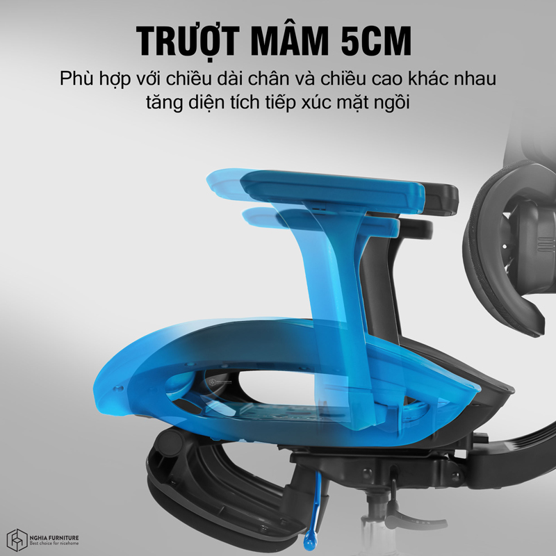 Mặt ngồi của ghế có thể trượt ra vào tới 5cm, cho phép bạn tinh chỉnh độ sâu theo đúng chiều dài đùi, giúp: