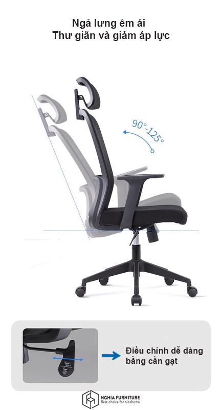 Cơ chế 1 cần 1 khóa cho phép tùy chỉnh độ ngả linh hoạt – dễ dàng chuyển đổi giữa tư thế làm việc và thư giãn.