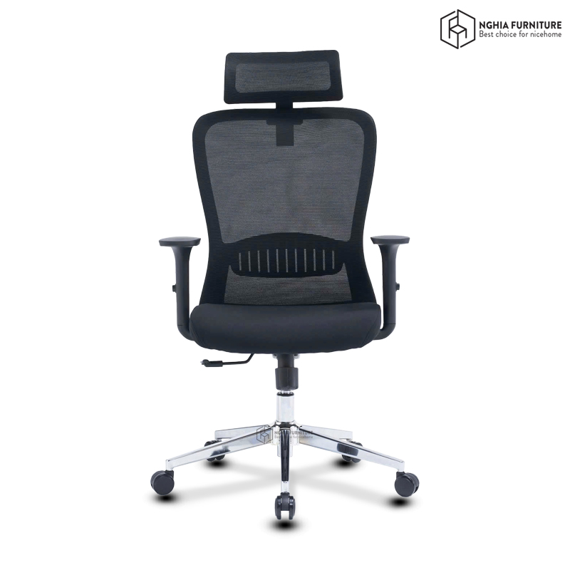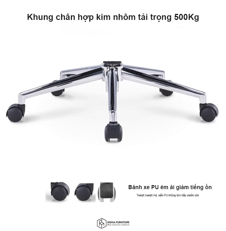 Chân ghế hợp kim mạ chrome đường kính 350mm kết hợp bánh xe BIFMA giảm ồn 50mm, giúp di chuyển êm ái trên mọi loại sàn mà không gây trầy xước.