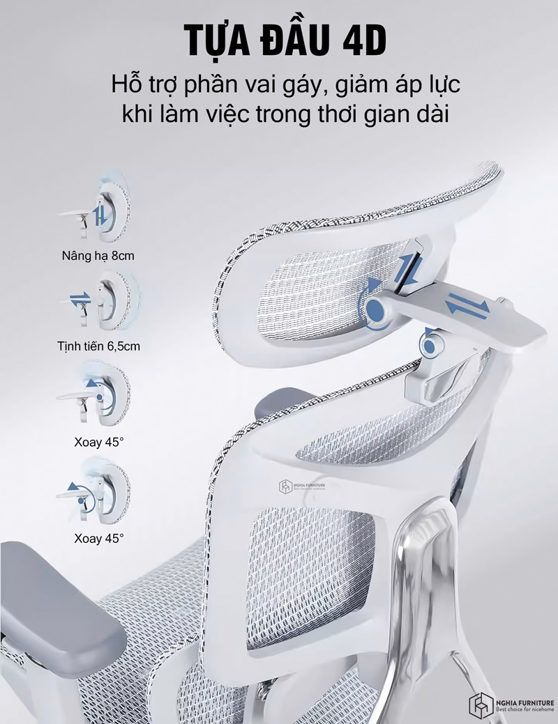 Thiết kế tựa đầu của Yami cho phép điều chỉnh theo 4 chiều, với 2 điểm tùy chỉnh: tại phần khung và trục trượt sau. Nhờ đó, cổ và vai luôn được nâng đỡ đúng tư thế, giúp giảm căng cứng cơ và ngăn ngừa thoái hóa đốt sống cổ khi làm việc lâu.