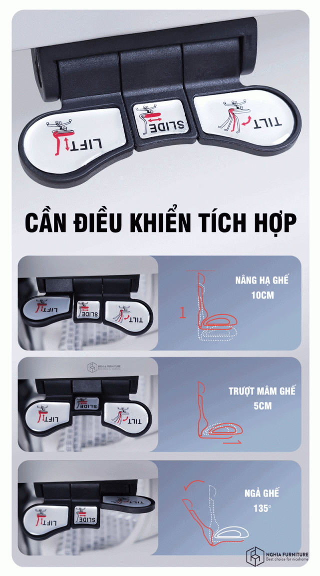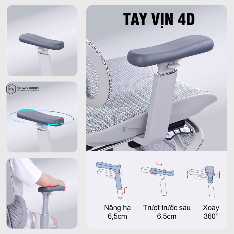 Tay ghế điều chỉnh được theo 4 hướng: lên – xuống, trước – sau, trái – phải (xoay 45°) và vào – ra. Tính năng này giúp bạn dễ dàng điều chỉnh tay vịn phù hợp với nhiều hoạt động như gõ phím, thao tác chuột hay nghỉ ngơi.